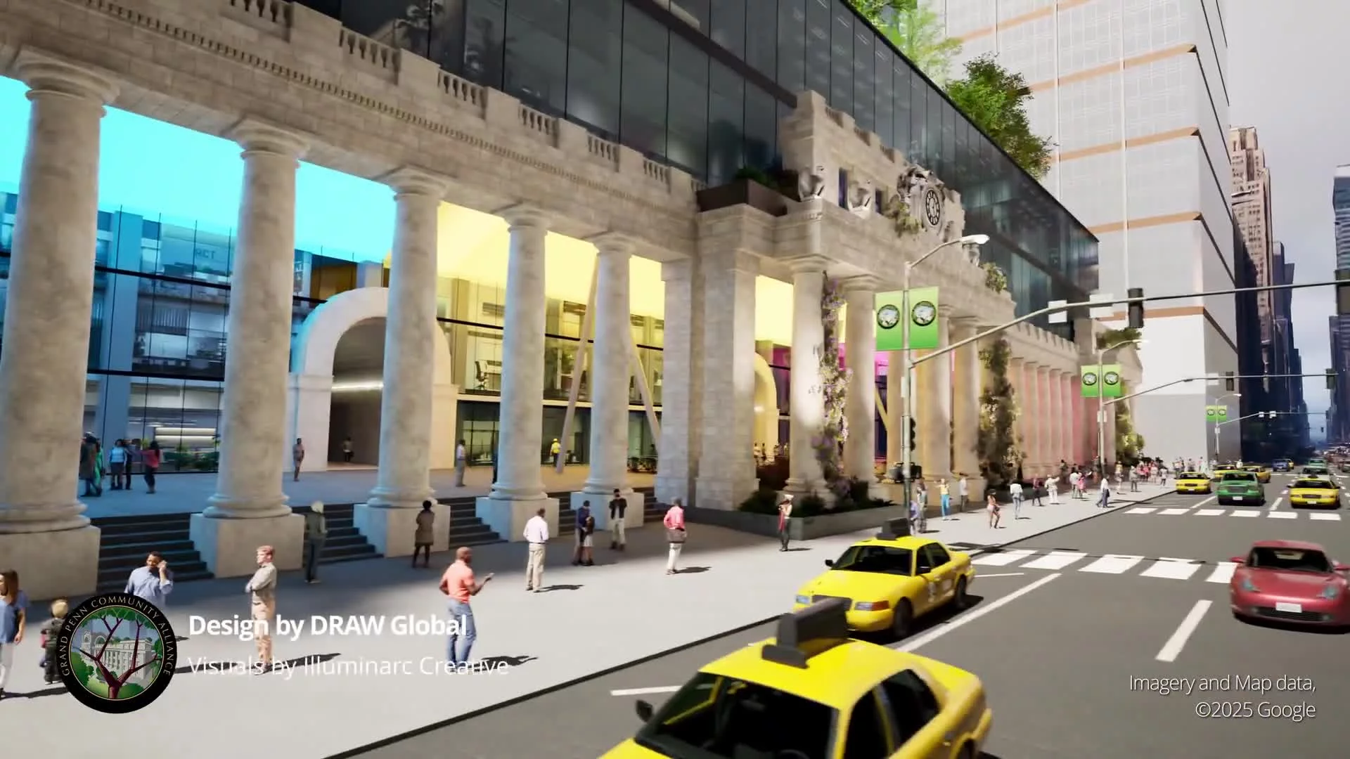 Panning across 8th Ave from the Farley building to MSG, we cross dissolve to the new Grand Penn park and fly over Two Penn to show the home of a new MSG arena off of 7th Ave.